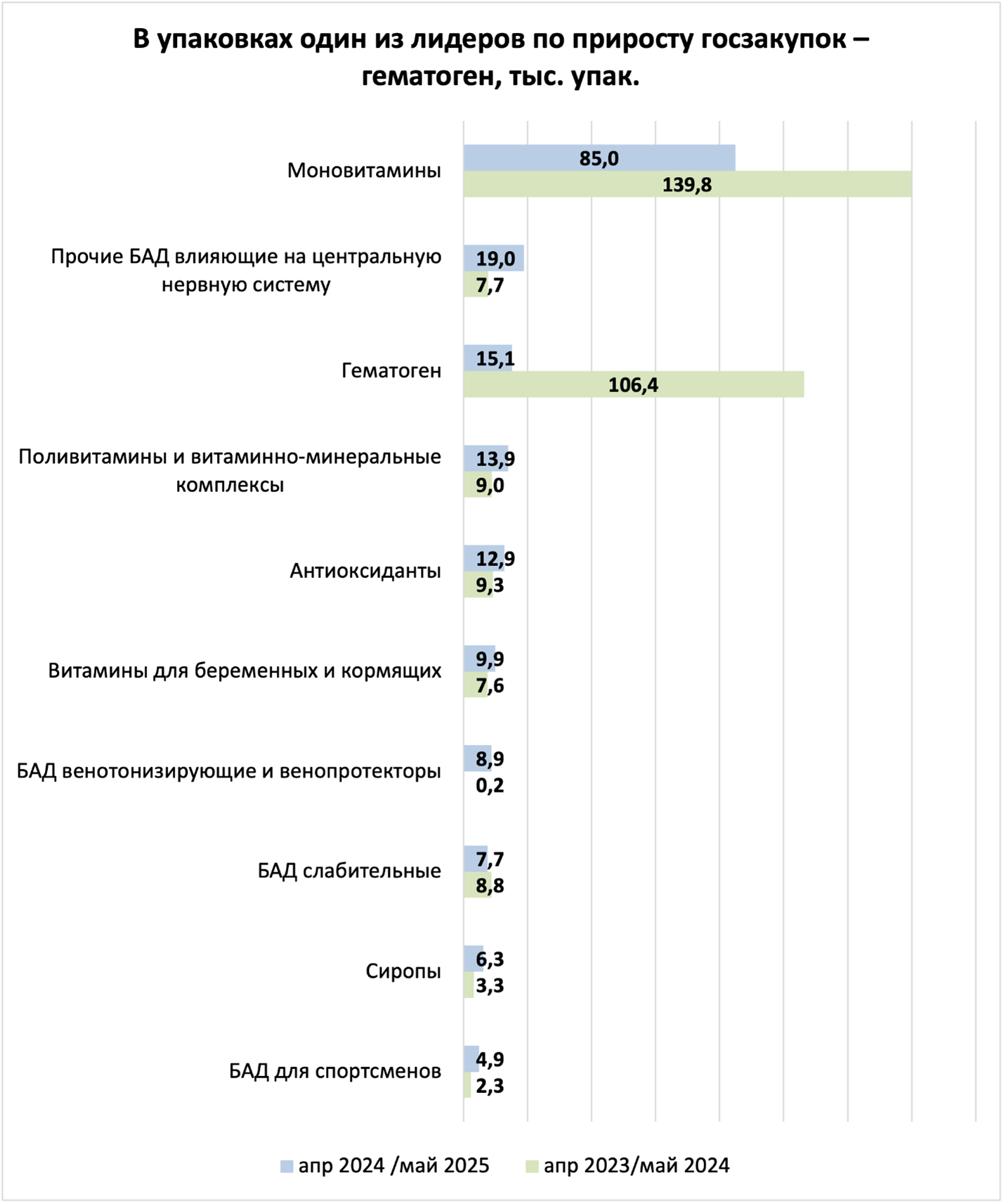 За 12 месяцев, с апреля 2024 года по май 2025-го, закупки БАД снизились на 1% в рублях, а гомеопатия выросла на 56%, в упаковках снижение на 43% у БАД и рост на 36% у гомеопатических лекарств. Снижение продаж БАД связано с уменьшением закупок в первые пять месяцев 2025 года, в упаковках падение составило 64%, в рублях – 39%.