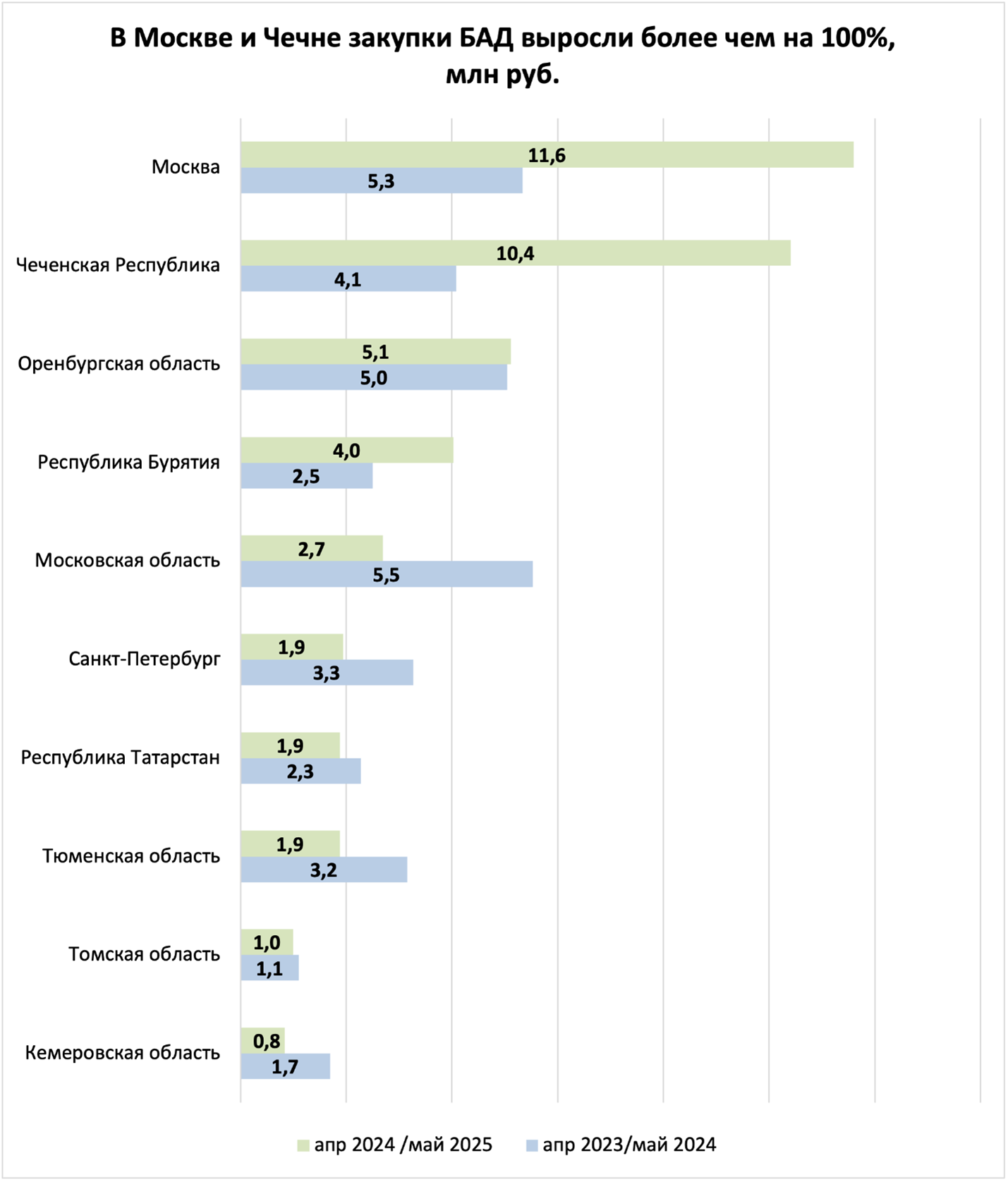 На первом месте по госзакупкам БАД – Москва. В апреле 2024 – мае 2025 года закупки столицы выросли на 117%. Вторую строчку заняла Чеченская Республика с ростом на 155%. Московская область и Санкт-Петербург, которые обычно располагаются рядом с Москвой, по поставкам БАД на пятом и шестом местах соответственно. При этом закупки в Московской области снизились на 51%, а в северной столице на 40%.