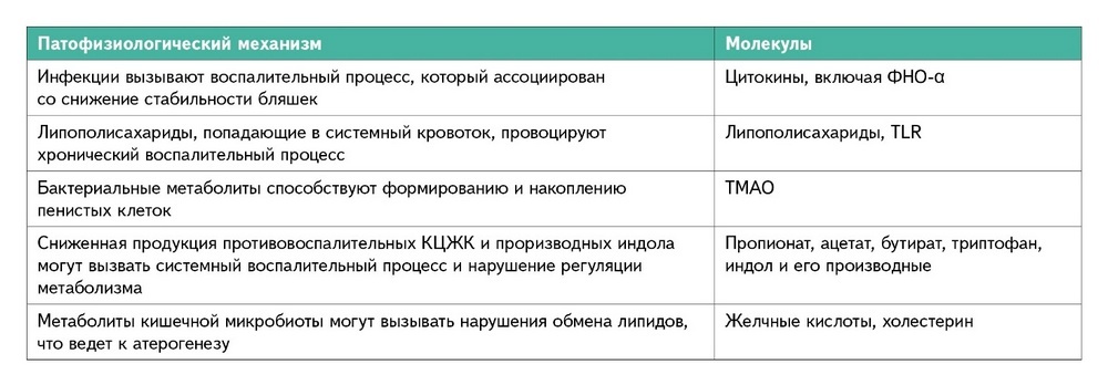 Микробные компоненты кишечника могут вызывать вялотекущее воспаление. Липополисахарид (ЛПС) грамотрицательных бактерий может проникать в кровоток через нарушенный или даже неповрежденный кишечный барьер, вызывать воспаление, предрасполагающее к атеросклерозу. Механизмы, через которые микробиота может влиять на развитие ИБС, мы описали в таблице.